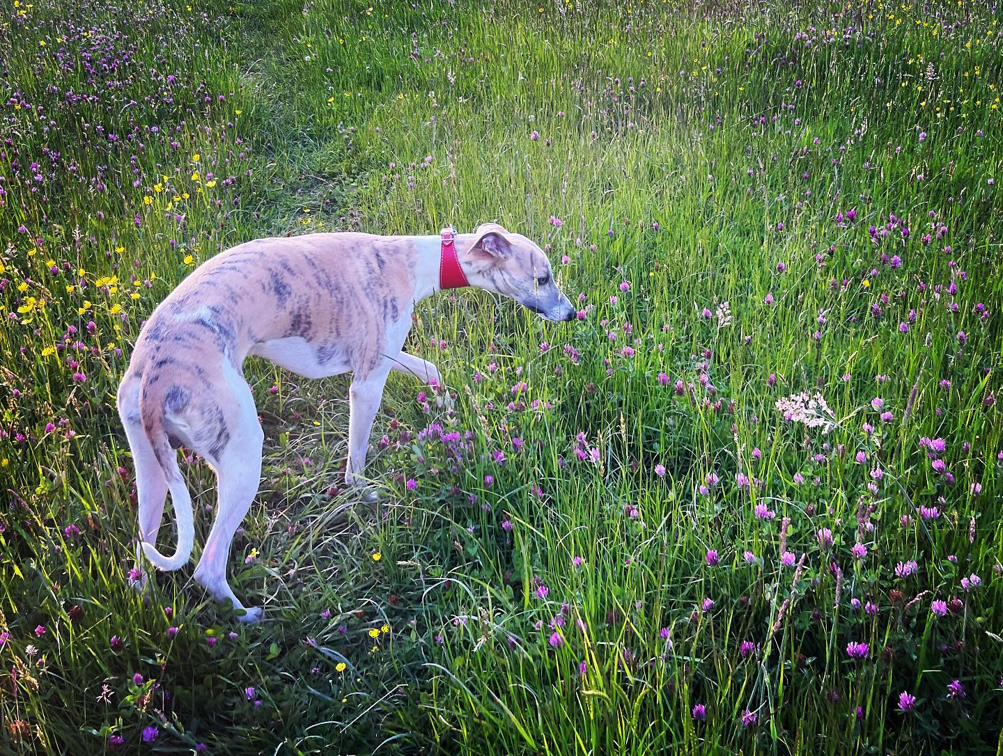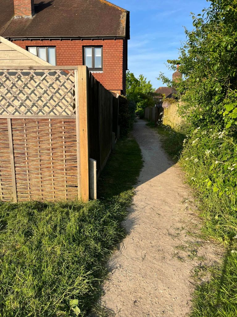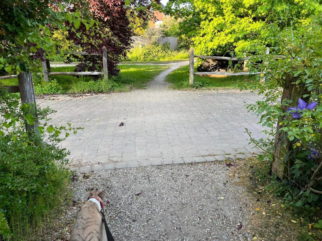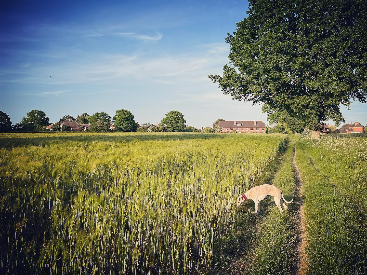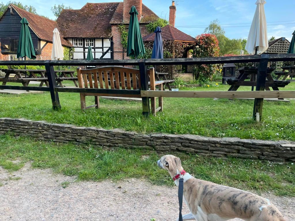 Ignore a small plank bridge to the left (it leads to a stile, unfortunately – the meadow behind said stile is really lovely and whippets can manage it but larger sighthounds cannot.) Follow this narrow path all the way to the cross paths and turn left. This is the Sussex Border Path. Follow this straight and it’ll bring you to a bridge.