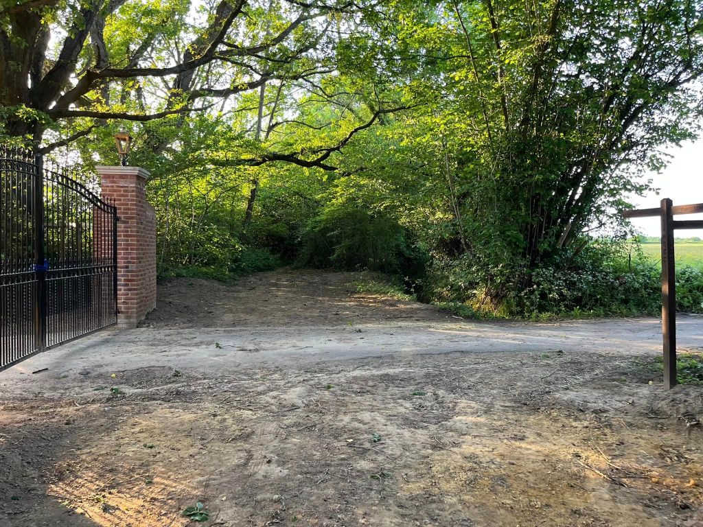 At the driveway, go straight across and walk a few more paces to the track and the finger post.
