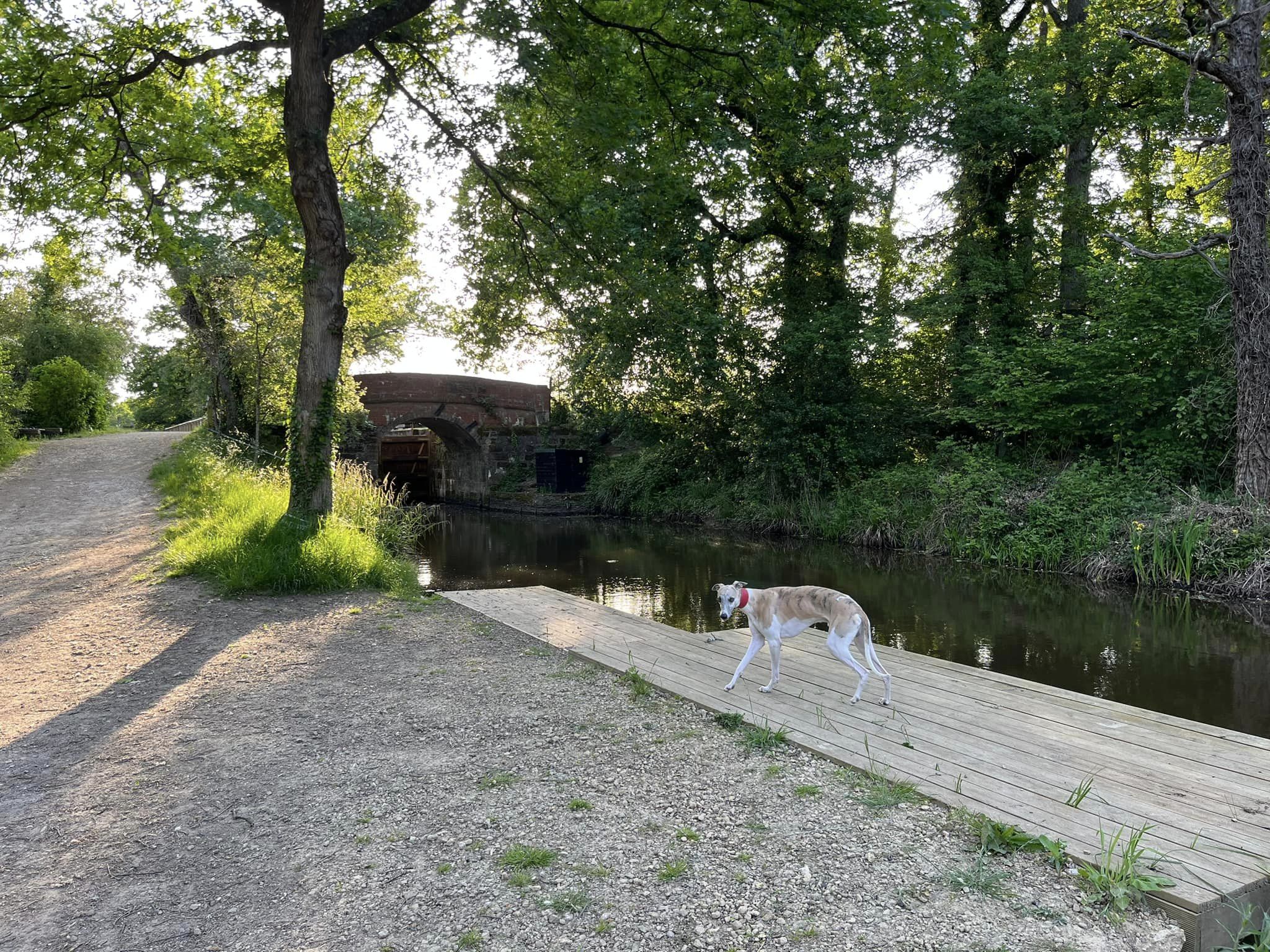 Turn right just before the lock gates and use the bridge to cross the canal. The path on the other side is narrow and sheltered through trees.