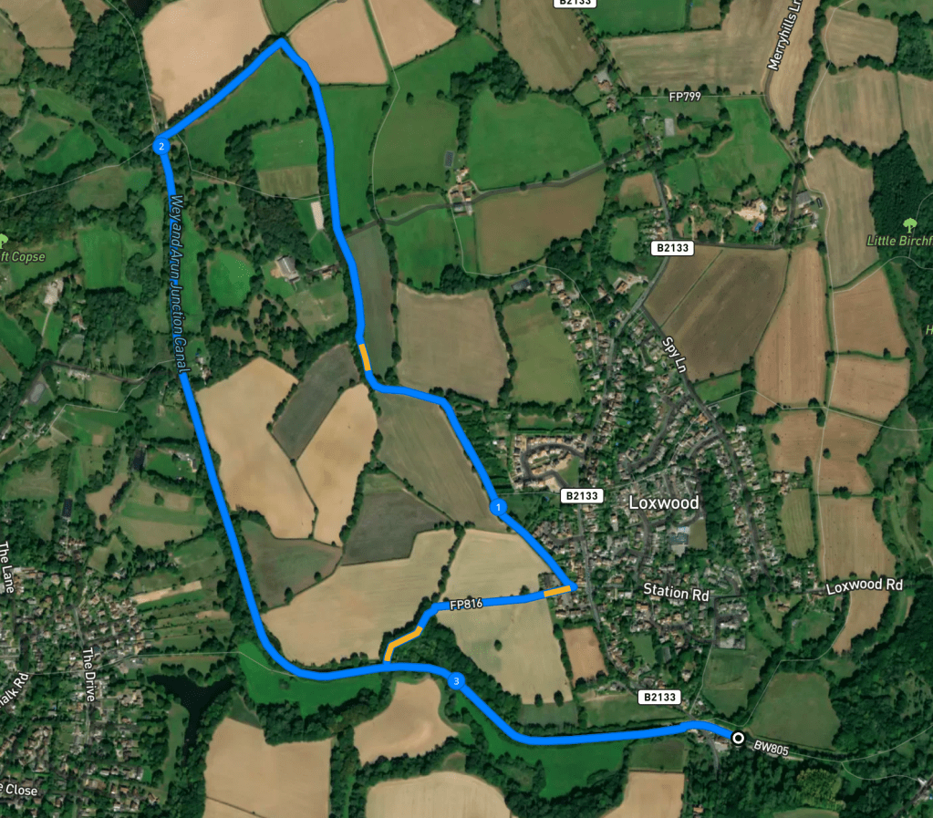 Here is a Footpath app route that will take you westbound from the canal centre at Loxwood, which is tucked behind the Onslow Arms pub. Also on AllTrails. This walk is a little longer than most of the walks on this site at nearly 3.5 miles long but it’s a flat walk and quite a lot of it is shady. You’ll initially follow the canal but then loop through Sussex countryside and briefly along the Sussex Border Path, before returning along the canal.