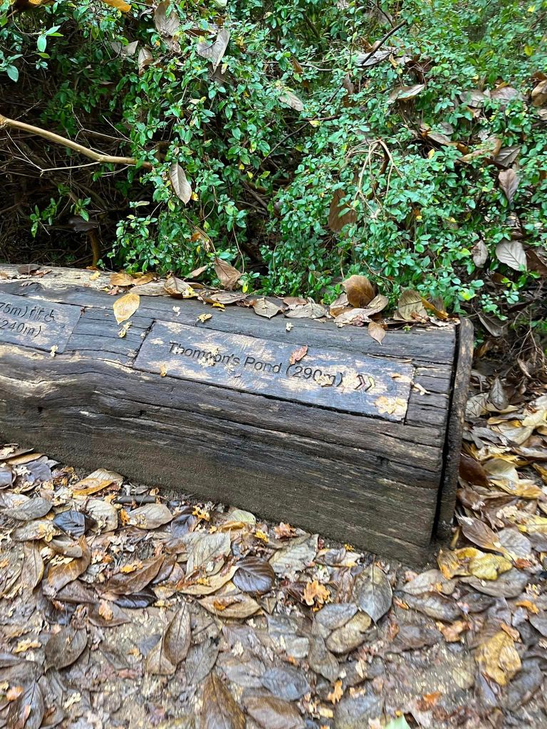 Continue ahead and over a series of log stumps to the pond (which is on the left), then turn right to take the path opposite the pond that heads away from the water (there is a bench on either side of this path.)