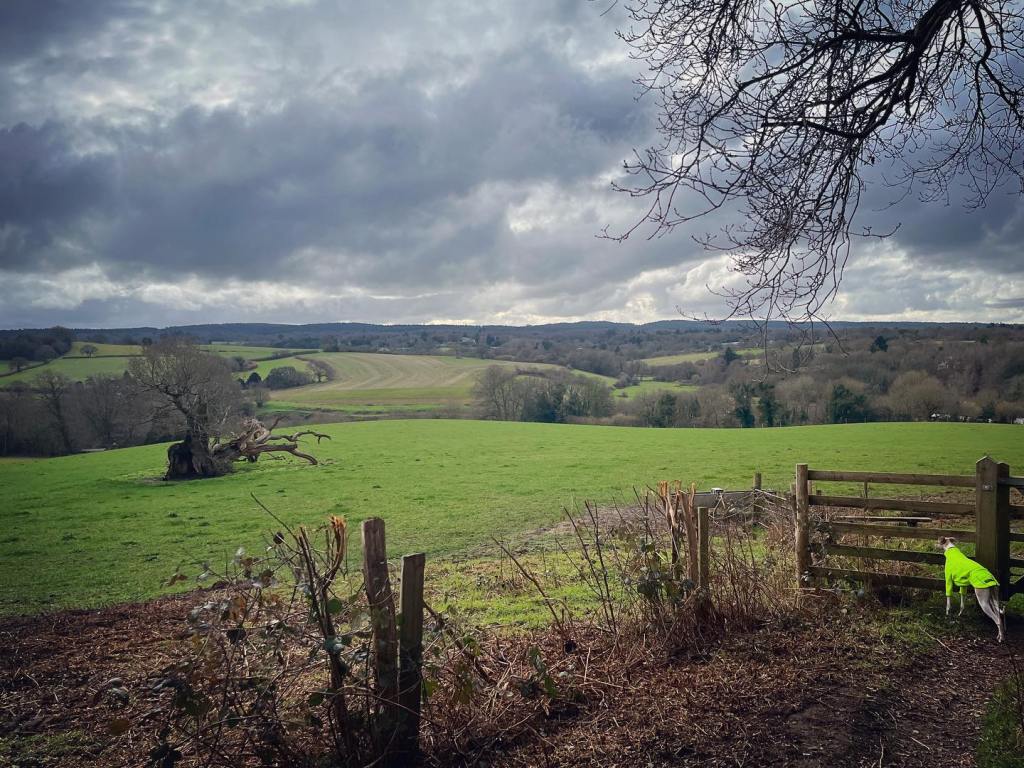 This is one of the most wooded areas of the Roughs. Some of the oak trees here are over 300 years old. The path passes along the edge of the woods, just inside the treeline with fields stretching down to your left. The large white house you can see is Abinger Hall, although not the original by any means. This one was built in 2019, but a succession of grand and increasingly large houses have been built on this site since the 16th century.