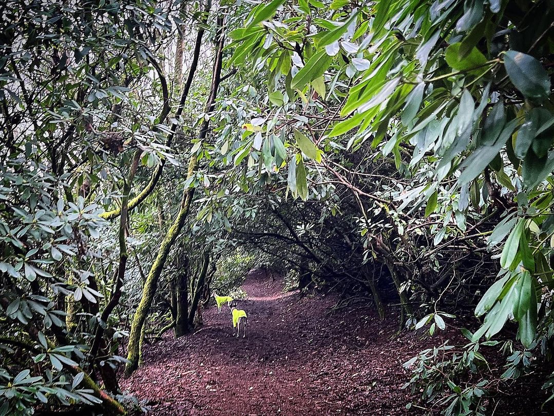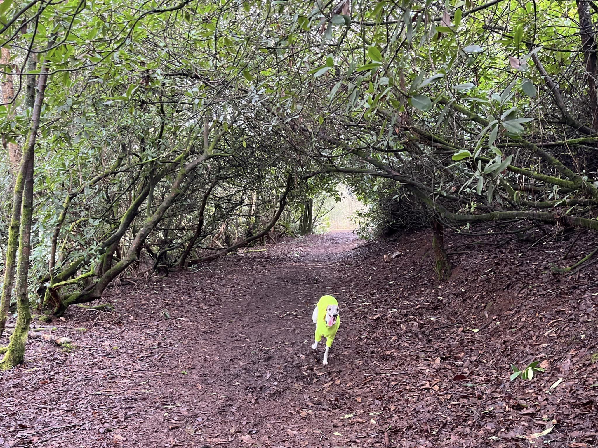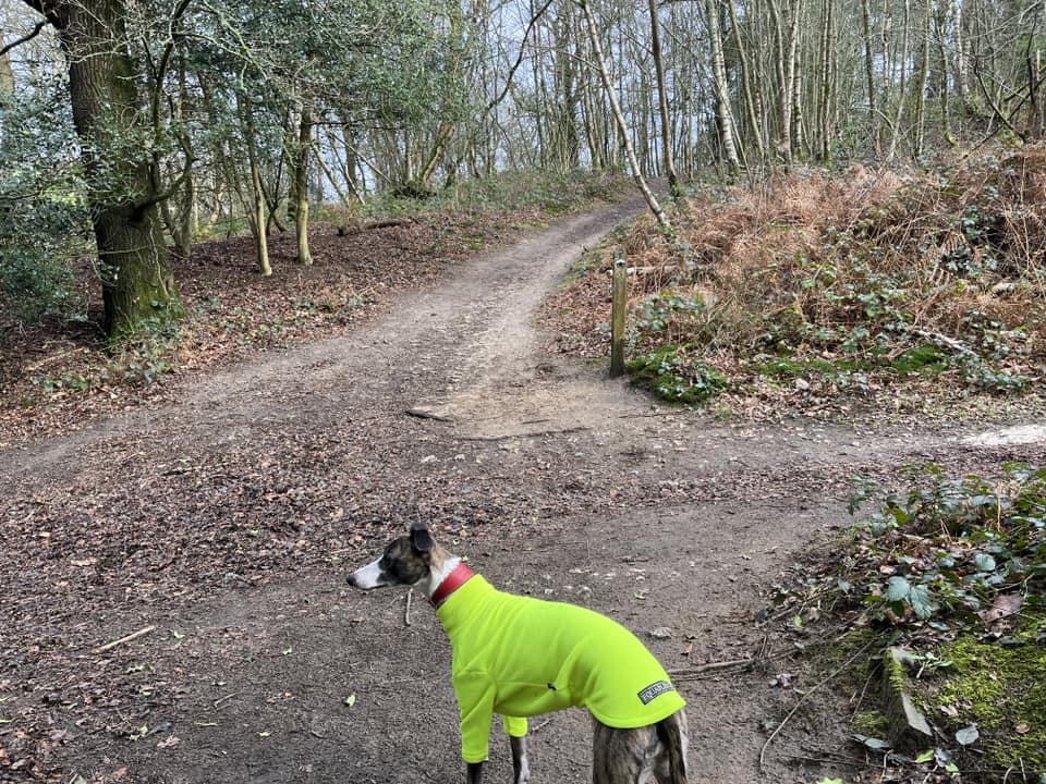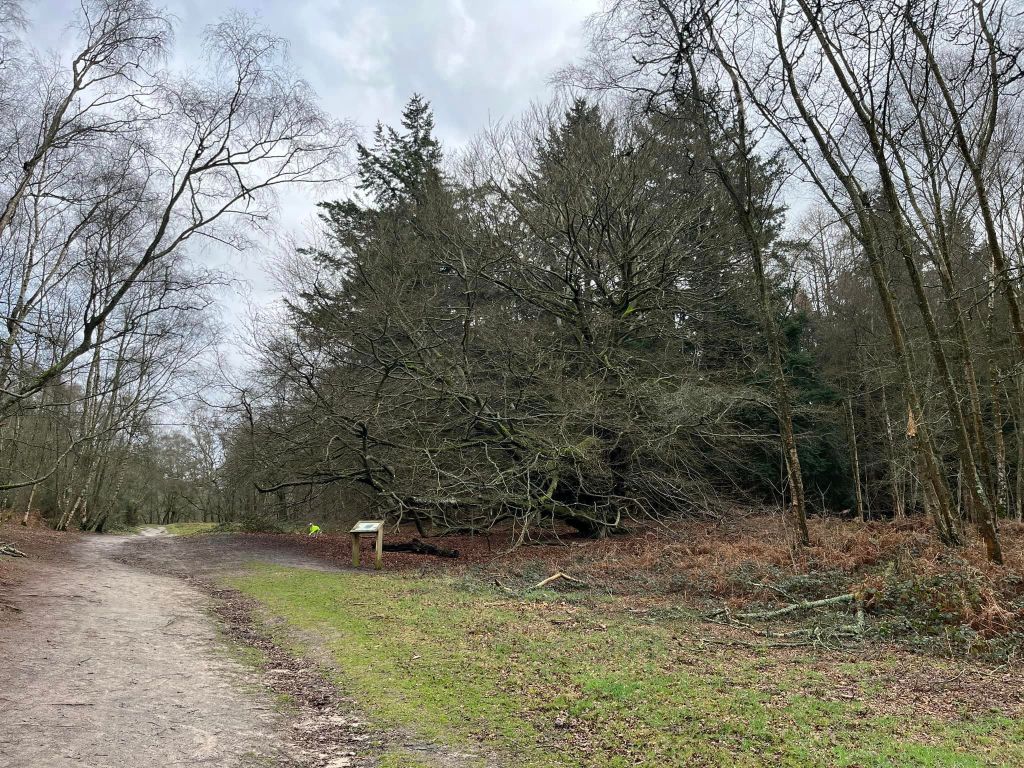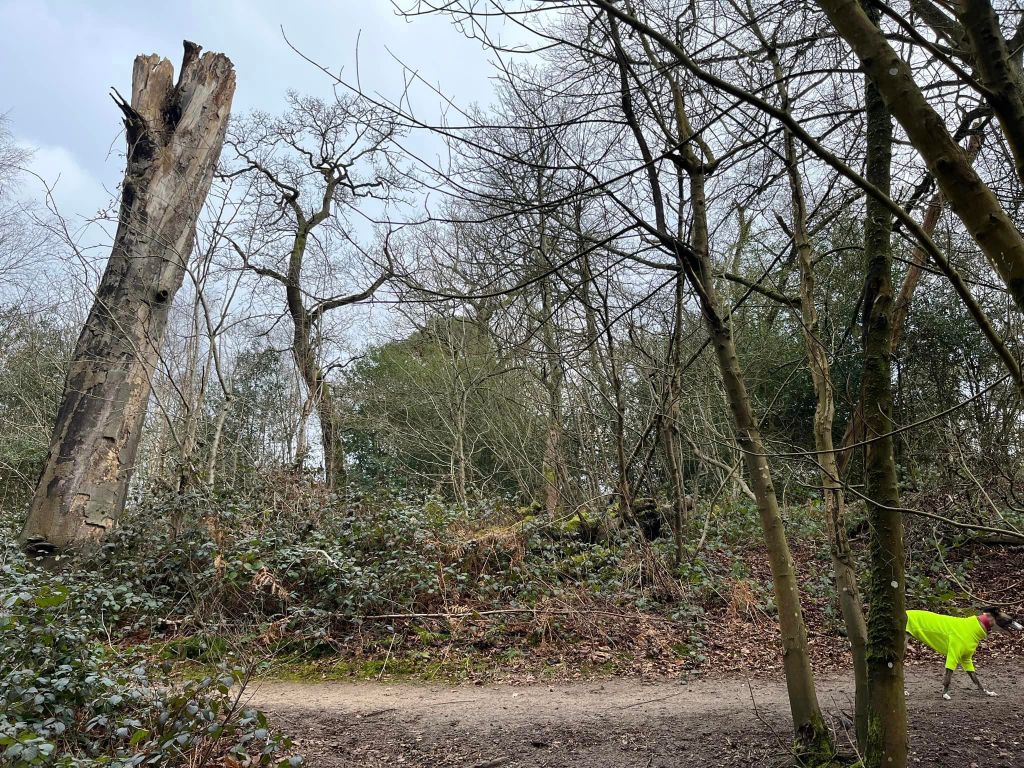 Walk between the trees and up to the little T junction by a tall dead tree. Turn left and follow this little path round to the right.