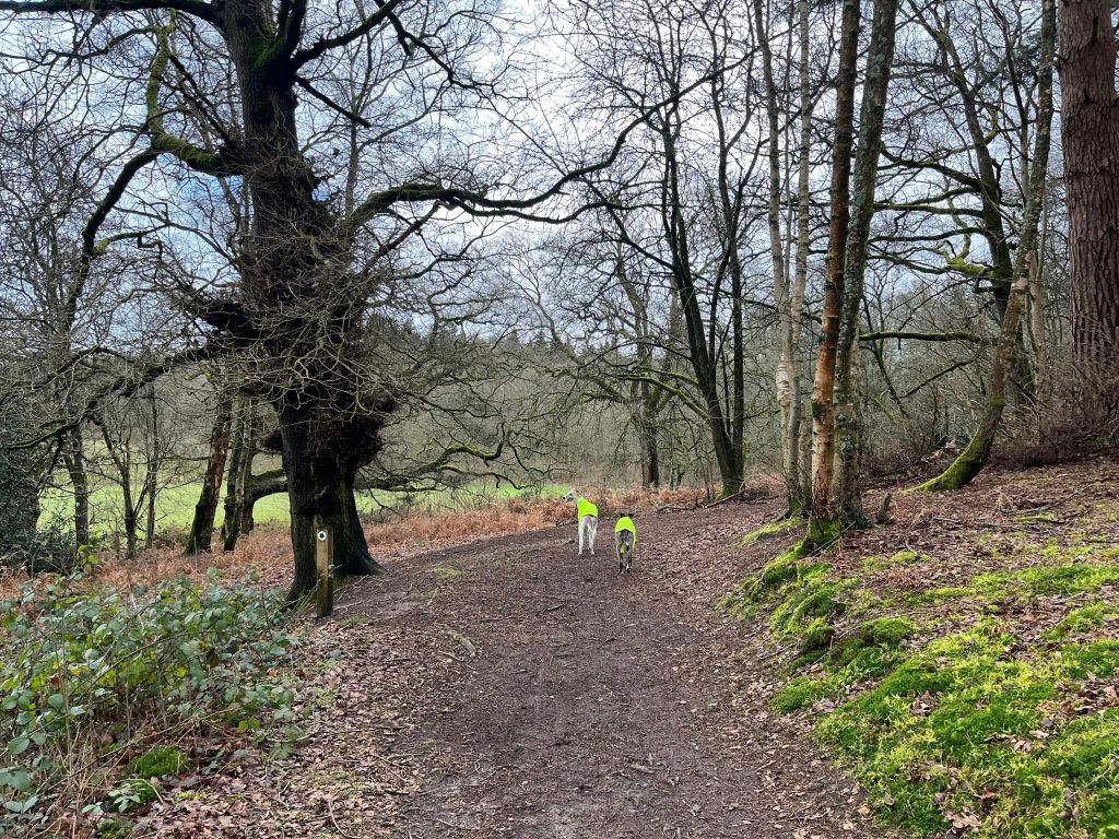 Go through the gate and into what’s known as ‘the neck of Abinger Roughs’ and continue straight ahead on the flat, then upslope again through another gate. Stay on the main path ahead, which is fairly open and passes to the left of another post.