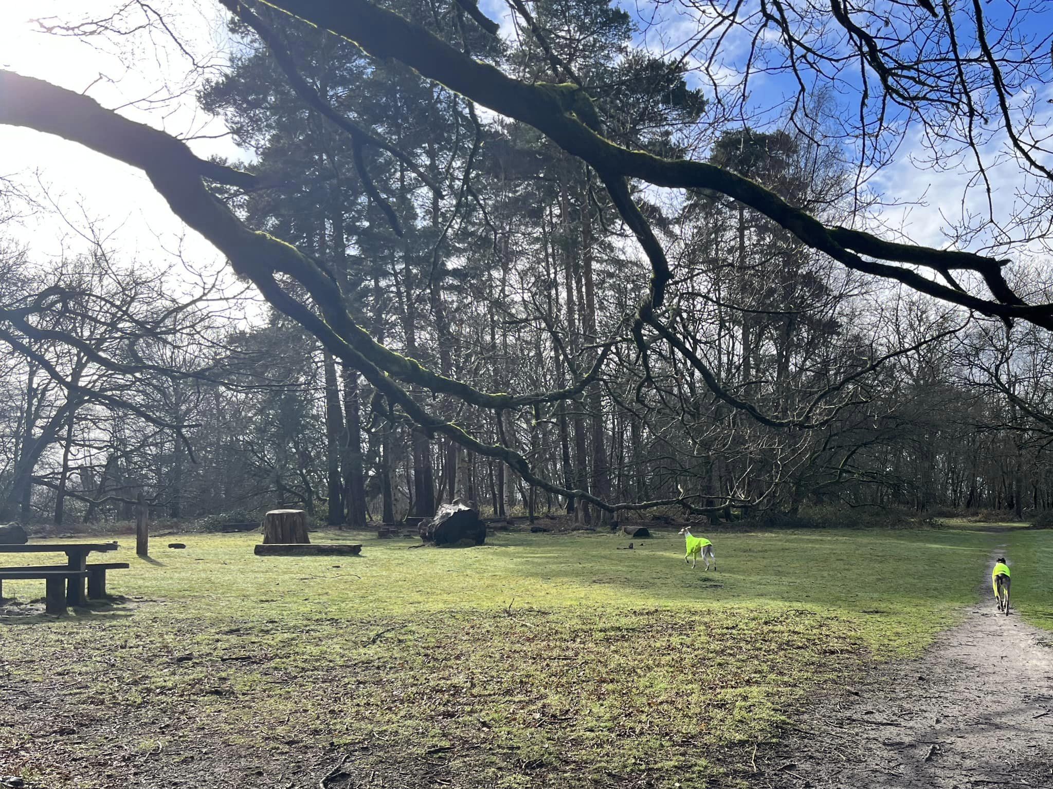 Pass through trees and a picnic and play area then back into trees. The tall trees here are Scots pines and around 200 years old. They can grow up to 36 metres tall and 1.5 metres around the trunk. Young trees have grey/green bark but as they grow older the bark turns orange.