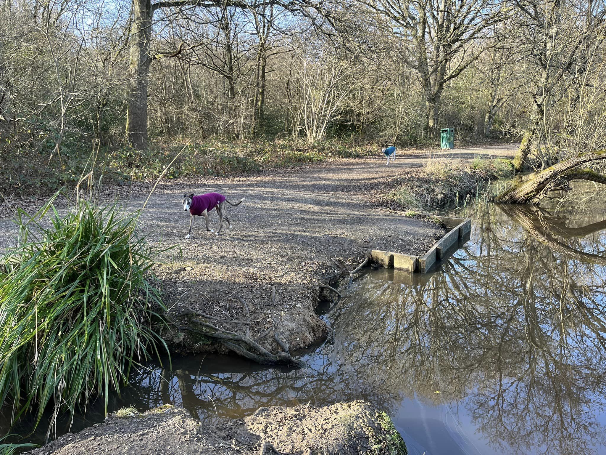 The path here can be muddy. Ignore two paths to the left (one immediately after the bridge, the second just after that, which has a plank bridge – these two paths are even muddier than the one you’re on so as nice as it is to be by water, we just won’t bother.)