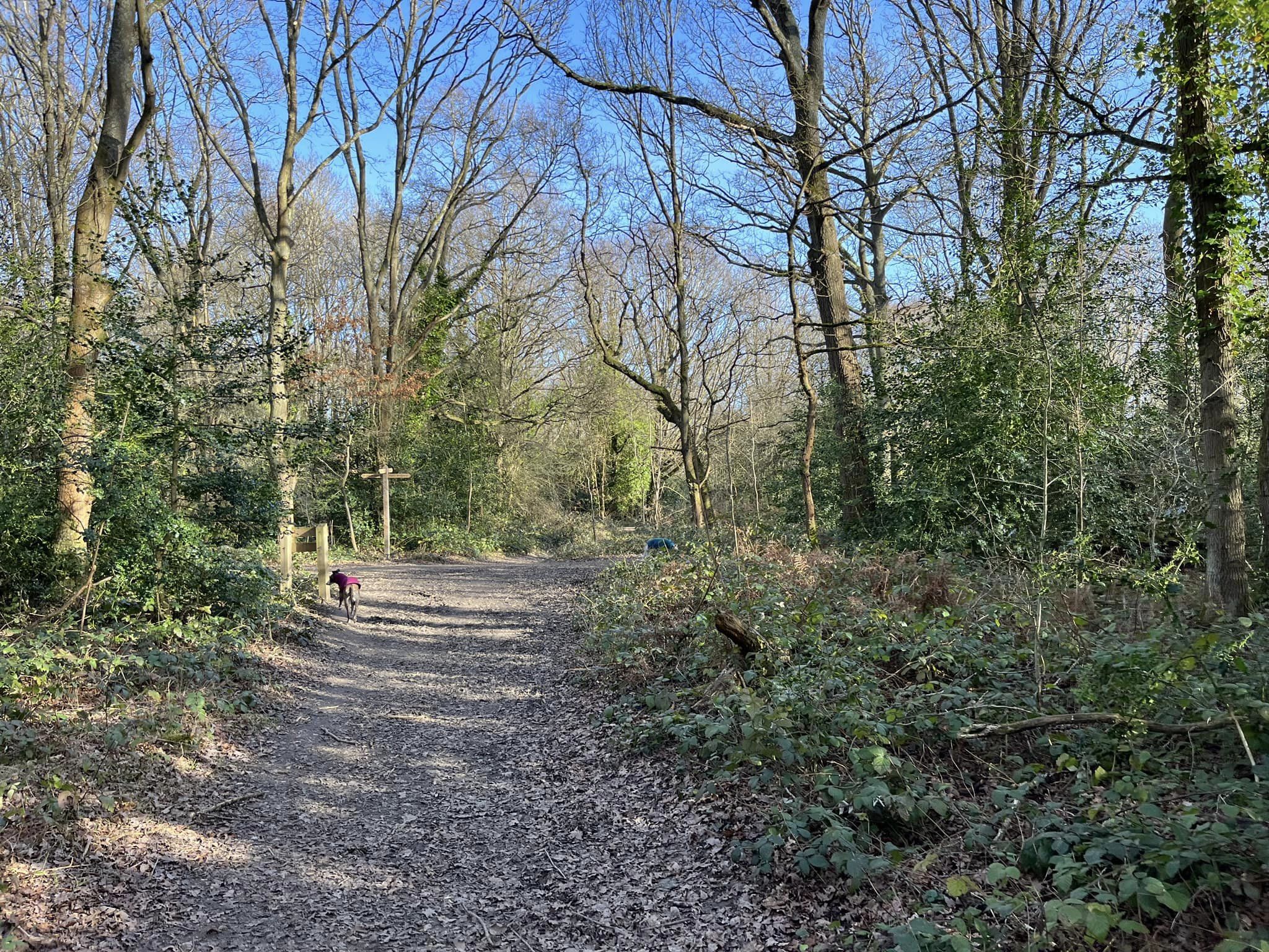 Continue ahead on this fairly small path, which winds through the woods and between holly bushes. There are a few tiny paths off here and there, but none that noticeable that you’re likely to go astray as you want to just stay on this path until its end. It emerges at a T junction with a main path, next to a gnarly dead tree. Turn left.
