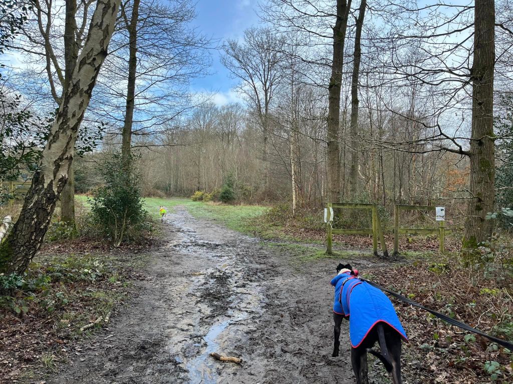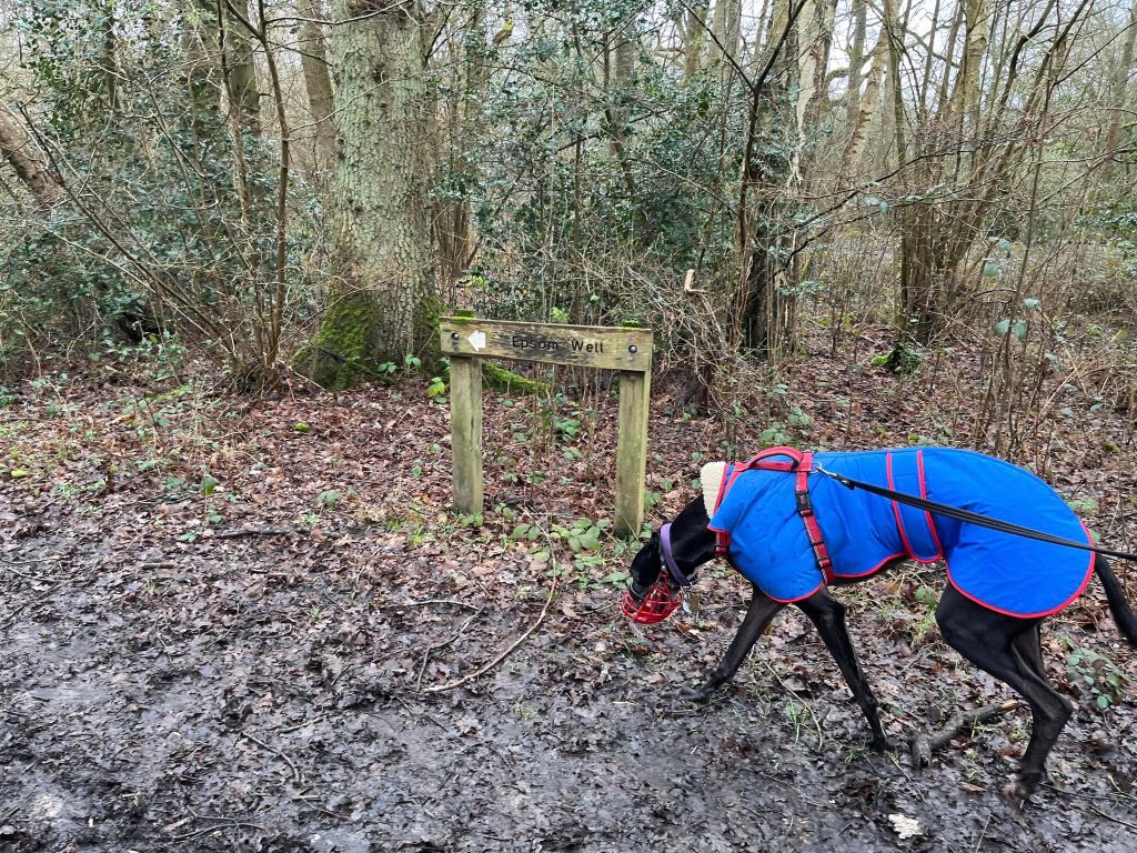 After some way, the woodland on the left will give way to a less wooded, grassy area. Just keep going. When you get to the T junction with the post for Wells Rd and the sign for Epsom Wells, turn left.