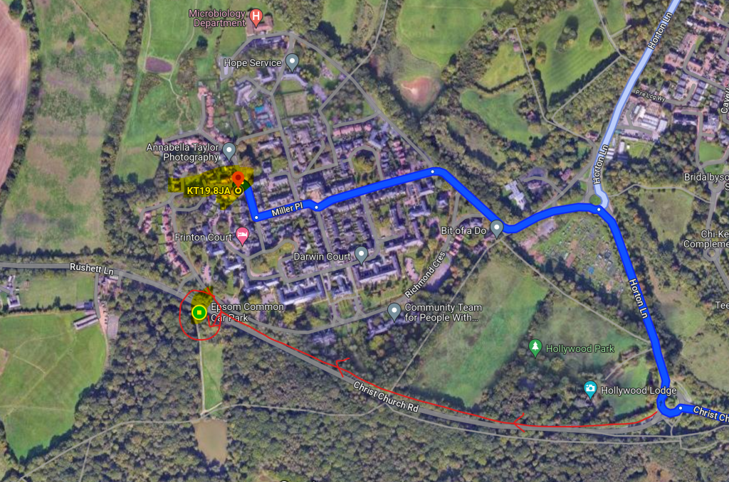 NEAREST POSTCODE: KT19 8JA but it’s really quite out – see map below showing centre of post code (which is where most sat navs will direct to) versus where the car park is