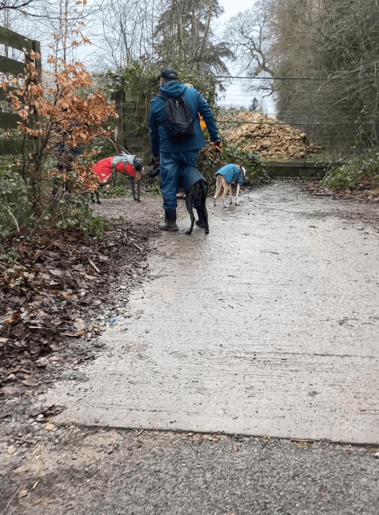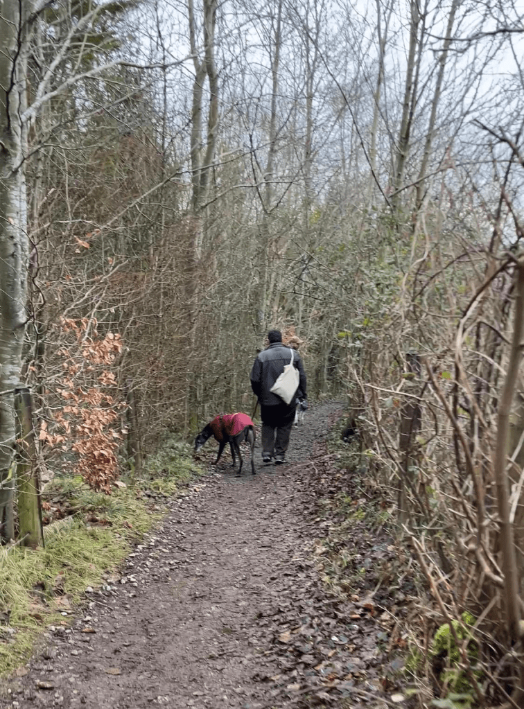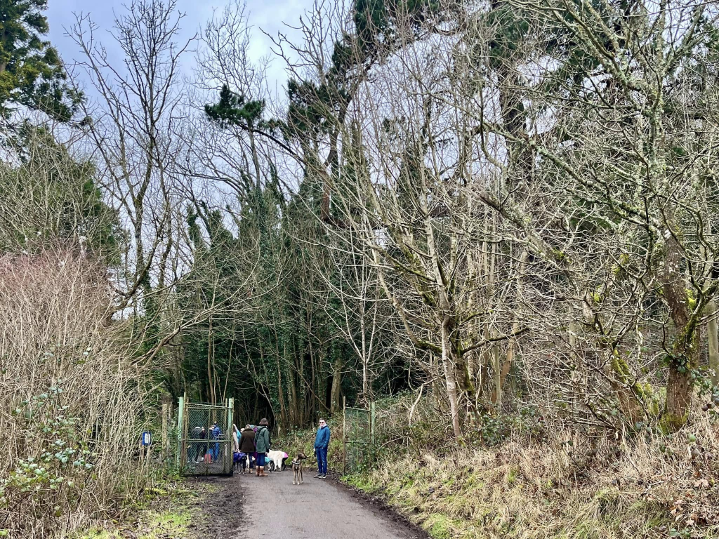 At this point, the view to the left is replaced by trees. Keep going. There’ll be a sort of turning spot and then a tarmac path/lane up to the right. Just after this and immediately before the way ahead is blocked off by a metal fence, turn left and head down the slope.