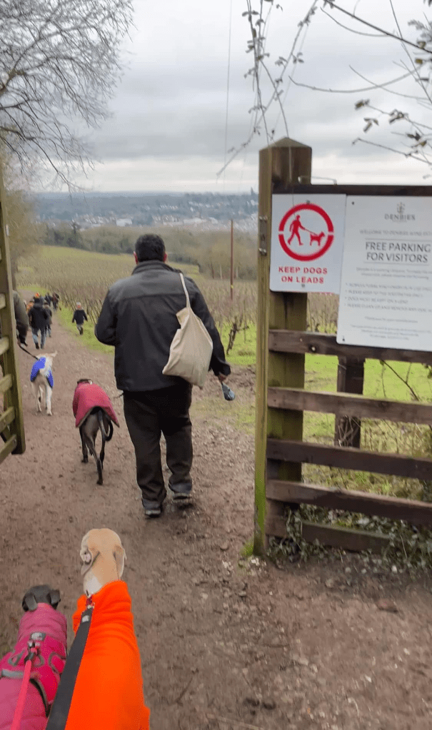 When you get to the next (wooden) gate on the left, with a sign for Denbies (says about free parking) and a dogs on leads sign, turn left into the vineyard.