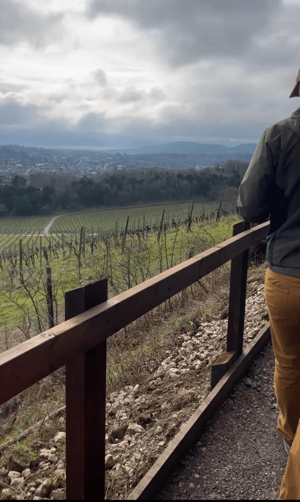 Terrain: You start with a long, fairly gentle slope up the hills – passing ‘Radius’ – and then you head downhill again. The first half of the walk is on surfaced paths, then as you head downslope, you’ll be on gravel/mud and mud paths through the vineyard.