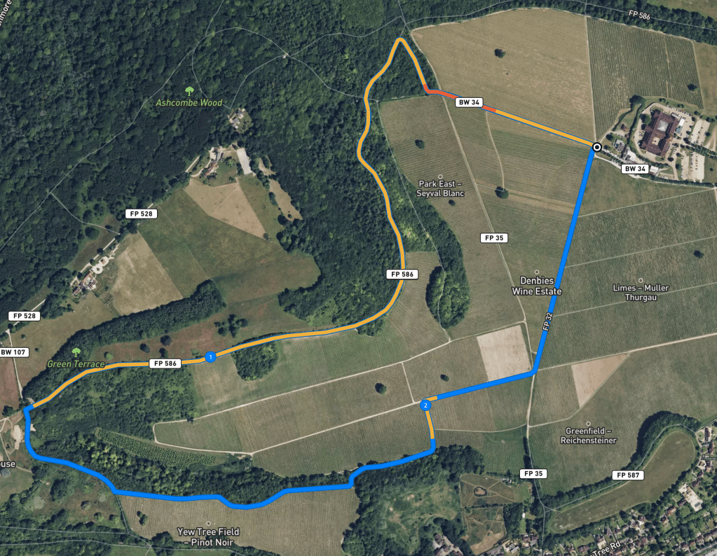Here is a Footpath app route from Denbies car park. Also on AllTrails. It’s a really simple loop up and along the top edge of the vineyard, then down one side. You then pick up the new Leith Hill Greenway, which takes you into the vineyard and back to the start.