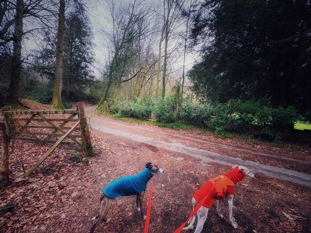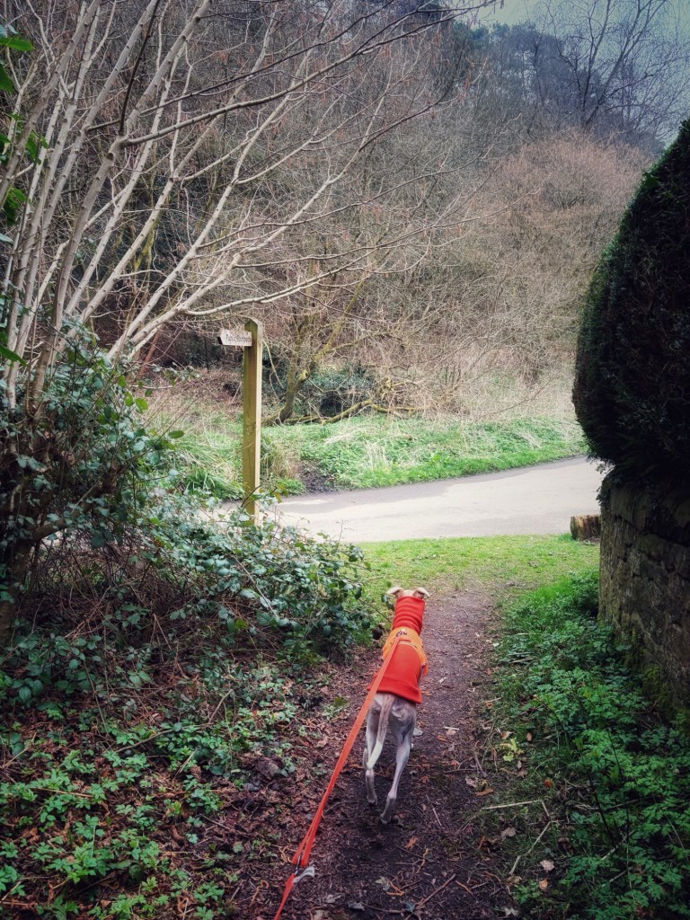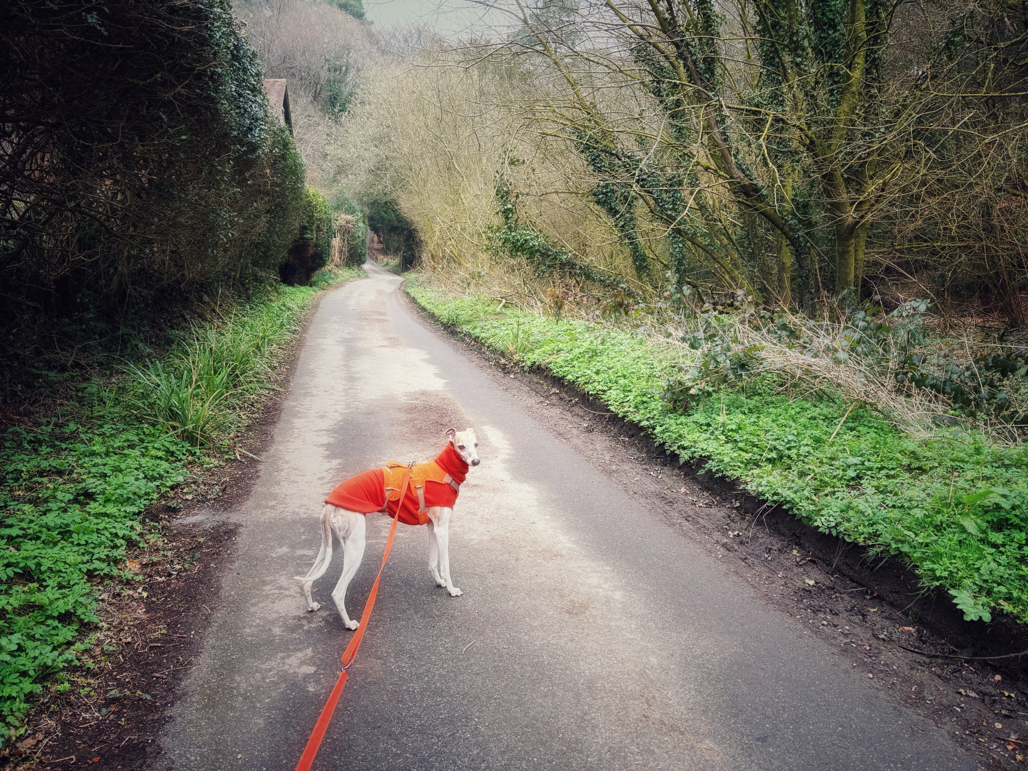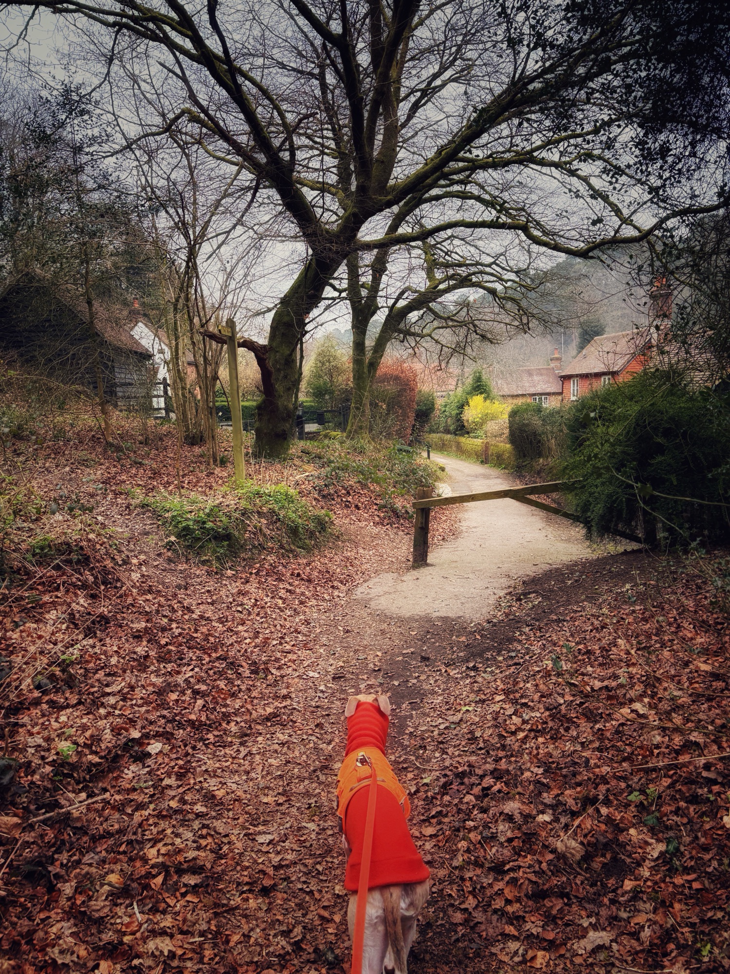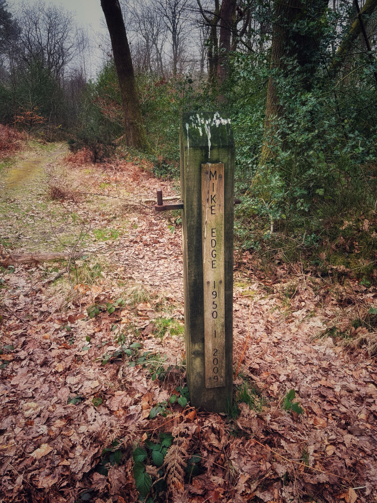 You’ll come to Abinger Common Road. Cross here, passing a post engraved with Mike Edge 1950 – 2009. I think this is weird because my dad was called Mike (which is why Mike whippet is so-called) and he was born in 1950 and died in 2009. His surname wasn’t Edge though, of course. Anyway.