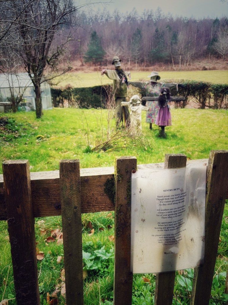 At the end of the lane, by a sign for High Trees, bear to the left. Pass the cottage and the scarecrows and keep going. At the end, turn left and cross the bridge, then go through the kissing gate.