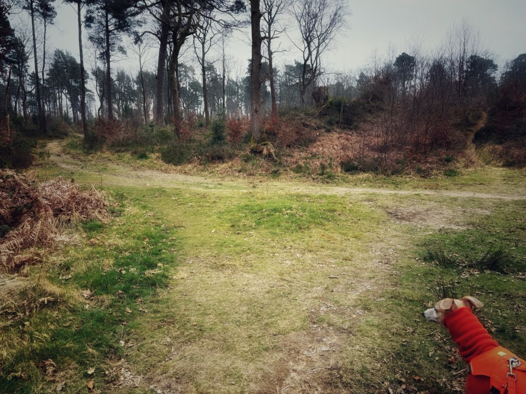 It’s straight on over the road. When you get to the cross paths where there is a finger post to the right and you can see the back of a road sign on the corner of Leith Hill Road further ahead, turn left.