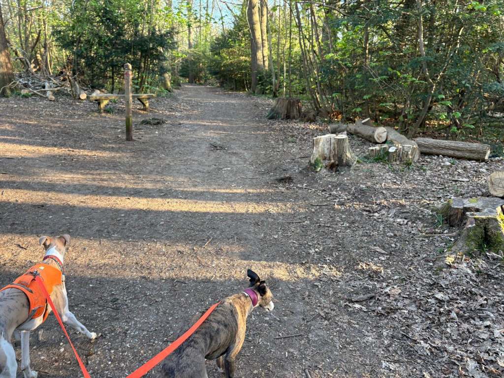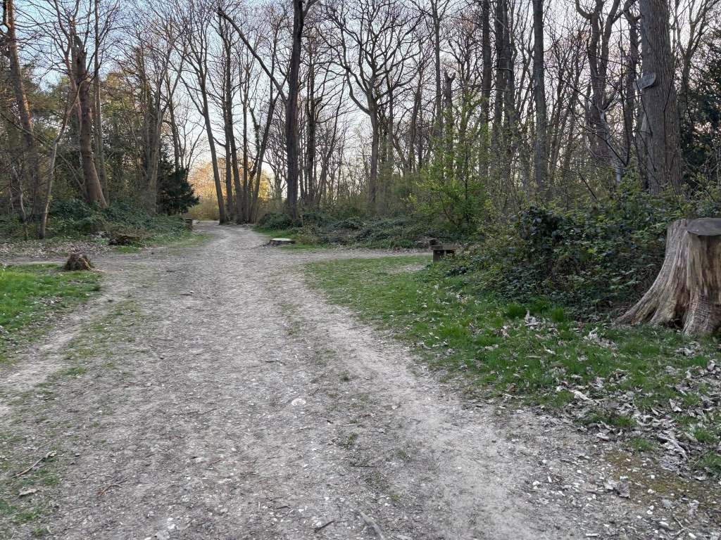 So, when you’re back at that cross paths with all the stumps, the bench is now on your right (with a sign for Court Wood Grove attached to the tree above it). There’s also a post with a green arrow. Turn right onto this smaller path. It’s called Beech Grove.