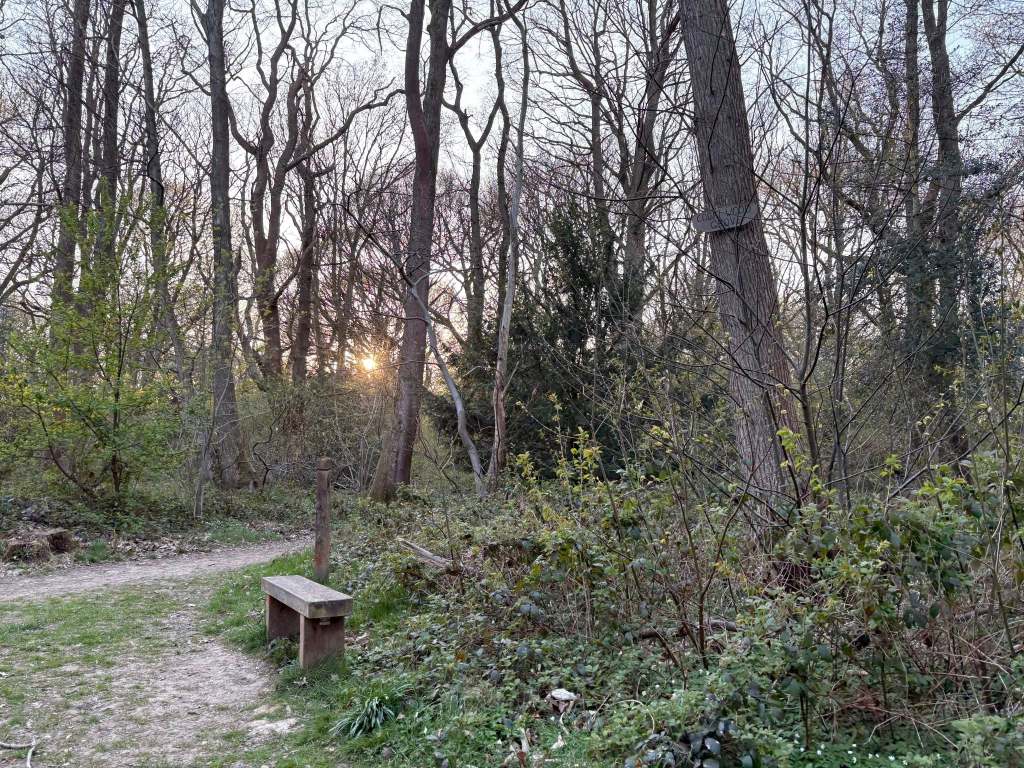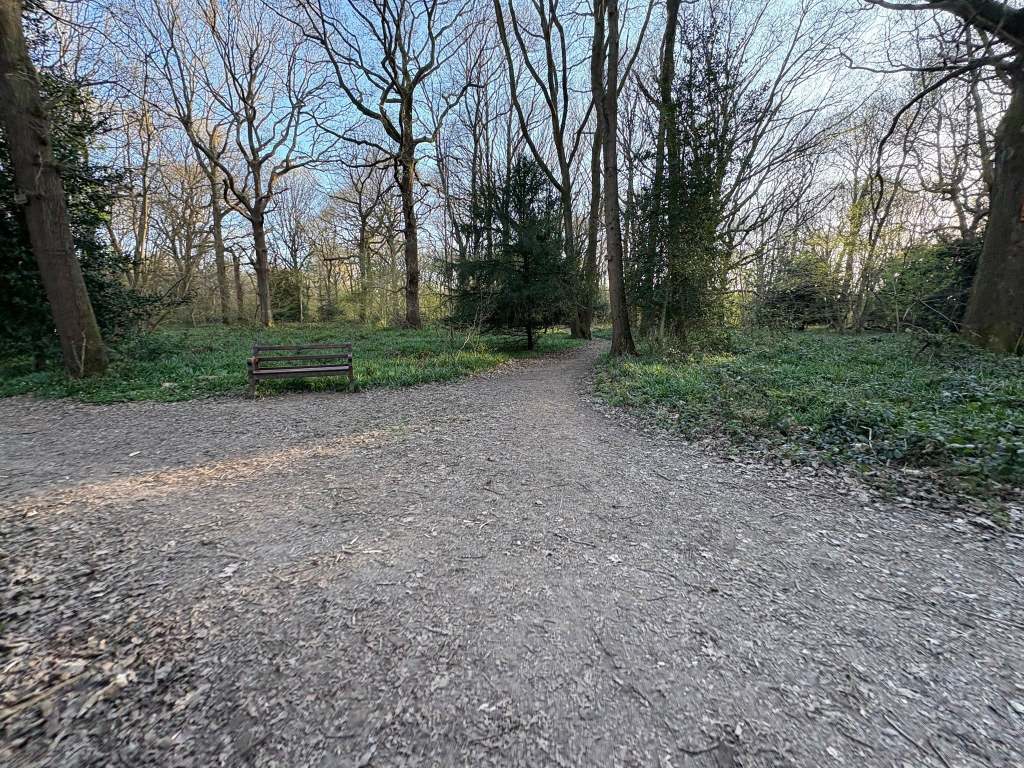 Turning off the main path here, you’re now on a little path called Bluebell Grove – and the reason it’s called this is evident during April and early May. Stay going straight on this path, crossing over a junction of paths with two benches to the right and a stump in the middle and another junction of paths with a bench to the left. It’s just ahead all the way to the end of the path, where it emerges from the woods at a field.
