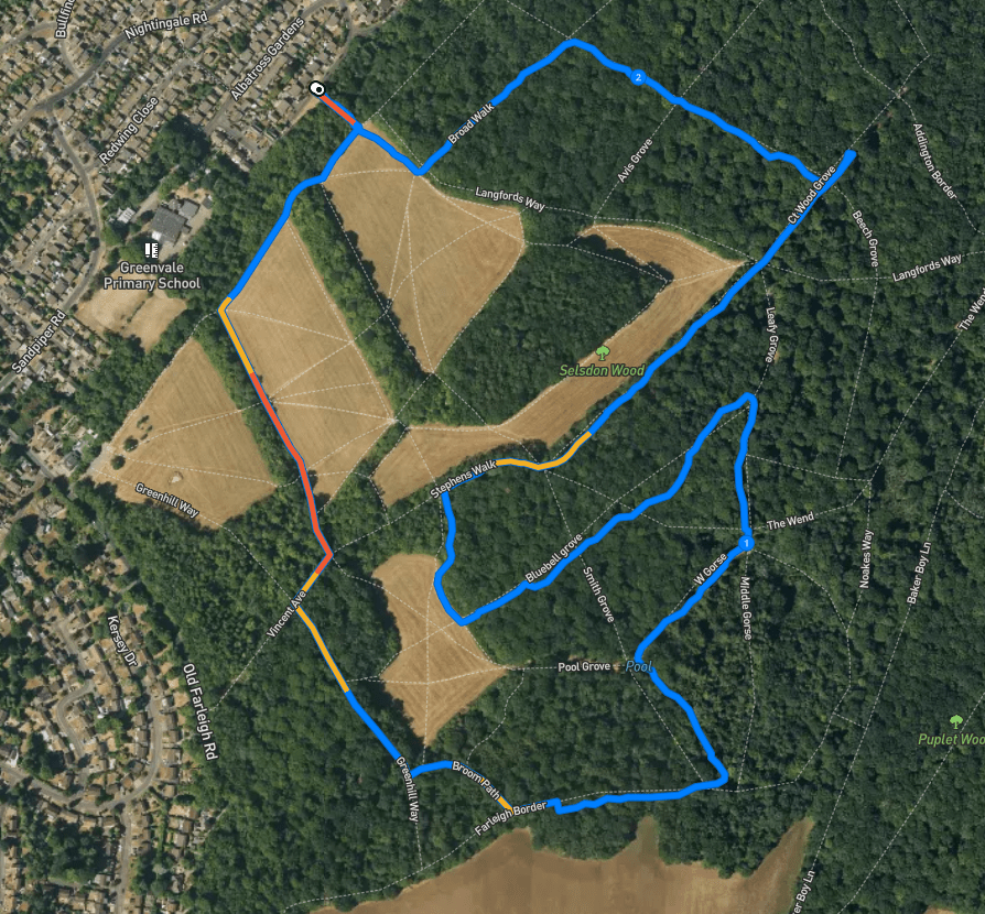 Here is a Footpath app route from the footpath into Selsdon Nature Reserve from Kingfisher Gardens. Also on AllTrails. This walk takes in the four carvings that were created during 2024 and 2025 but not the 1988 bear sculpture (if you want to see this, you’ll find it right by the car park so look at the map and find your way there). Most of this walk is through the woods, although it skirts a couple of fields to get to them.